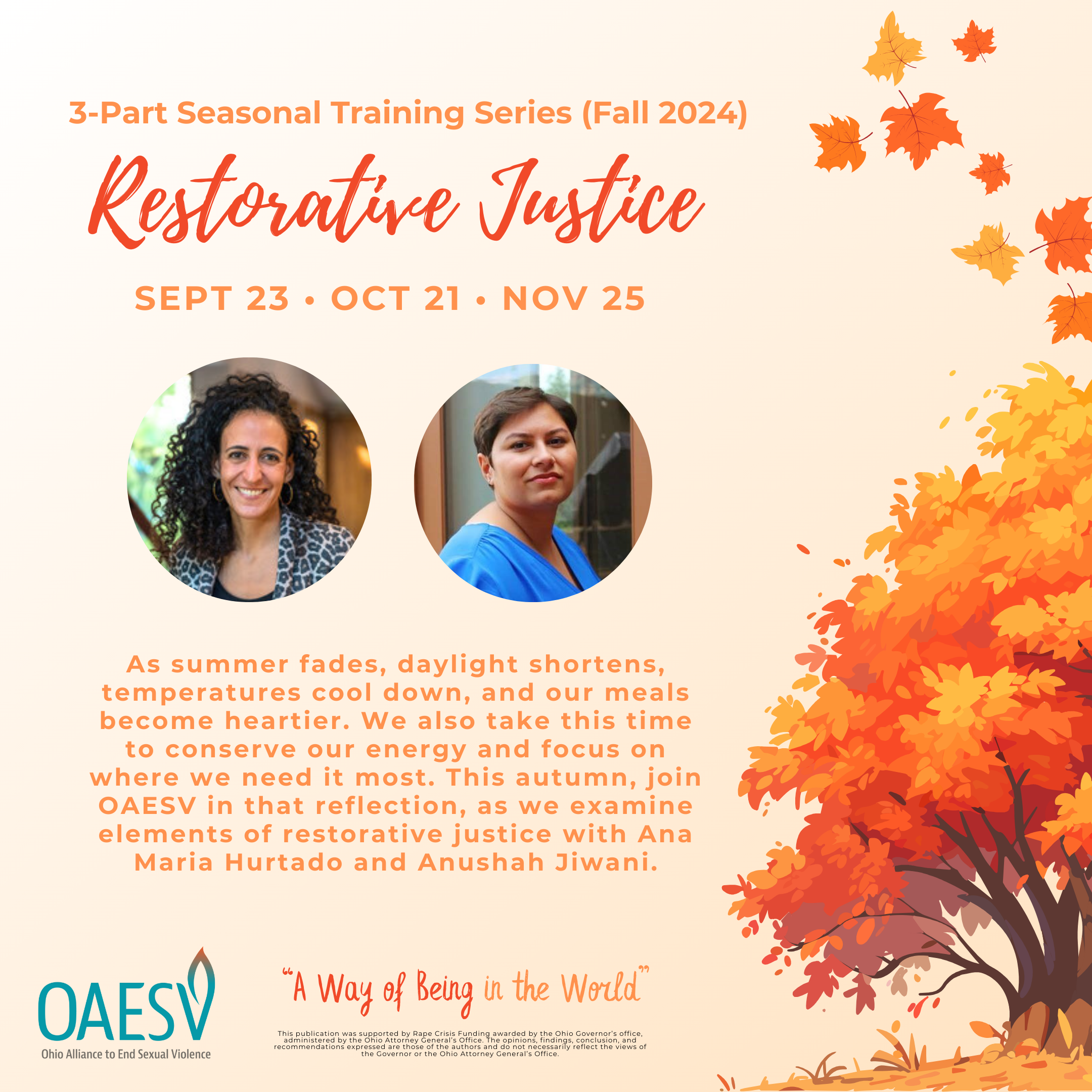 As summer fades, daylight shortens, temperatures cool down and our meals become heartier. We also take this time to conserve our energy and focus on where we need it most. This autumn, join OAESV in that reflection, as we examine elements of Restorative Justice with Ana Maria Hurtado and Anushah Jiwani.